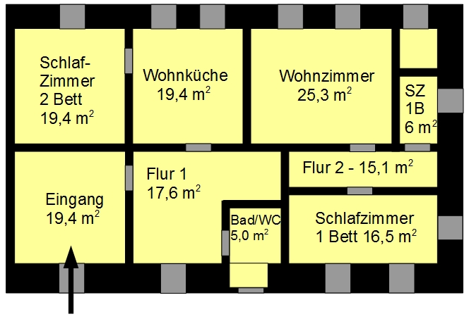 Die Ferienwohnung liegt im rechten Teil und hat folgenden Grundriss:
